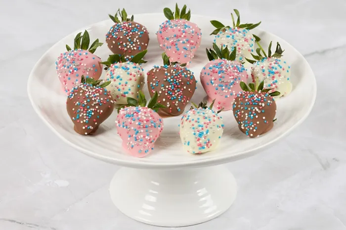 Every fresh strawberry is dipped in White, Milk or Pink Belgian Chocolate before being sprinkled with fine red, white and blue crunch.