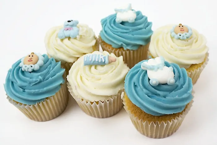 | 6 Large Cupcakes with baby decorations | |