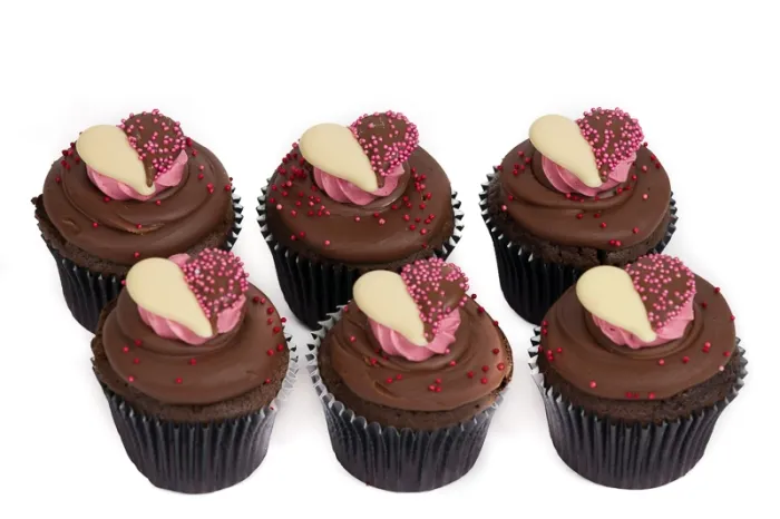 A scrumptious box of our popular Belgian Chocolate Cupcakes each topped with an indulgent Raspberry Waffle Chocolate . Each freshly baked cake is made with rich Chocolate Cake then topped with generous swirls of Belgian Chocolate Ganache. They are then hand decorated with a Belgian, Heart Shaped, Chocolate which has a luxurious Raspberry Creme filling sandwiched between milk/white chocolate layers.