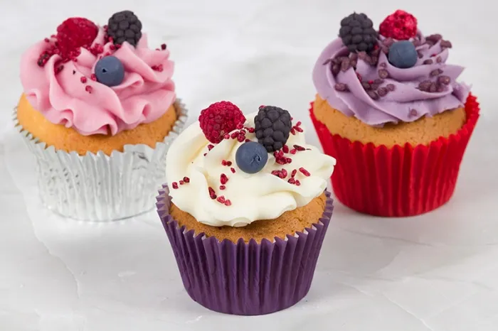 Made with a vanilla Genoese sponge, each cupcake is filled with a tangy soft Ruby chocolate centre before being topped with either strawberry, blackcurrant or vanilla frosting and an assortment of fruit themed decorations. Each collection has toppings that include freeze dried raspberry pieces and edible blackberry and blueberry decorations made from fondant icing. A fragrant blackberry crunch is sprinkled lightly on top.