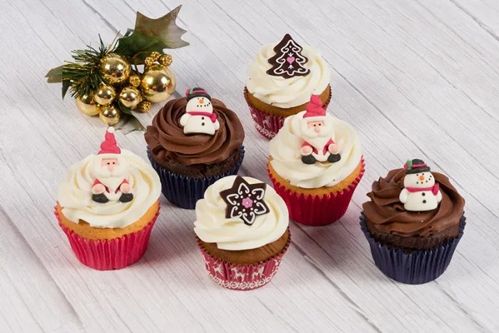 We hope you will enjoy our selection of Christmas cupcakes with a variety of flavours to suit everyone. Try our traditional Gingerbread cupcake frosted with Vanilla Icing, our Chocolate cake with Chocolate frosting or Madeira sponge with Vanilla frosting. All topped with a seasonal decoration