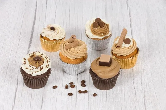 These elegant cupcakes have been created with coffee lovers in mind. With a mix of coffee, chocolate and vanilla sponge bases, each cupcakes is carefully hand piped with a selection of vanilla and coffee cream frostings before each cake is topped with a variety of delicious coffee flavoured decorations. You will find crispy cappuccino wafers, coffee beans, cappuccino buttons, mocha crunch and more.