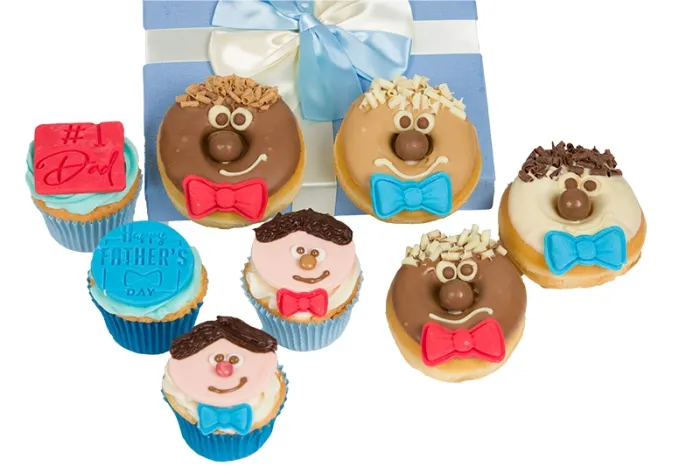 Send Dad something unique and super tasty with our variety box of Cool Dude Donuts and Best Dad Cupcakes. Every donut is hand dipped in either white, caramel or milk chocolate and then decorated with a smiling face, comprised of chocolate eyes, chocolate curls for hair, Malteser nose and an edible handmade bow tie decoration. Our cupcakes are made with Vanilla sponge and frosting then decorated with a handmade sugar disc with assorted cheery faces and stamped Best Dad and No 1 Dad messages. Ideal gift for Birthdays or Fathers Day (when we would include a Happy Fathers Day message)