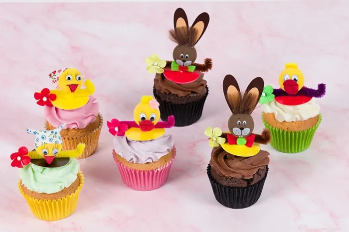A fun alternative to Chocolate Easter Eggs, this cute box of Vanilla and Chocolate Cupcakes provides a sweet Easter Treat. Each cake is decorated with a naturally flavoured frosting, including strawberry, vanilla, blackcurrant, lemon and chocolate before being decorated with assorted Bunny and Chick non-edible decorations
