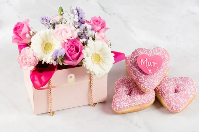 This delightful gift contains a combination 4 of our delicious Pink Heart Donuts with sprinkles and an accompanying arrangement of fresh flowers presented in a Handbag design flower bag with ornamental gold chain. The donuts can be personalised with a name if required and the bright and colourful flower arrangement adds a vibrant splash of colour for any occasion.