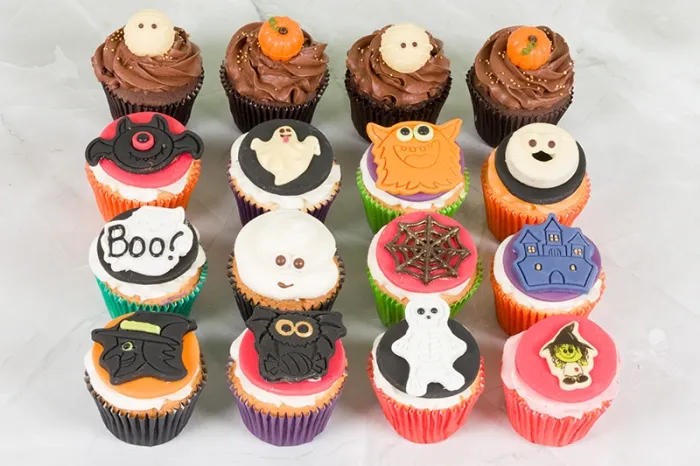 Celebrate the witching hour with a special bumper batch of our Spooky Halloween cupcakes. Made from a selection of fluffy Madeira sponge and rich chocolate cake decorated with different coloured frosting and handmade sugar discs, each cupcake is lovingly hand decorated with scary Halloween characters including ghosts, ghouls, bats and witches. Each set includes hollow chocolate pumpkins and mummy heads.