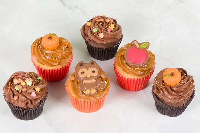 What could be more enjoyable than a selection of seasonally decorated cupcakes made with toffee, apple & cinnamon and chocolate bases topped with creamy toffee and chocolate frostings. With a variety of Autumnal decorations including decorative sugar leaves , chocolate pumpkins, owls and apples these decorative cupcakes would make the perfect surprise.