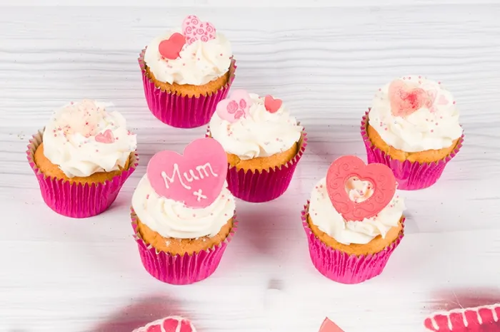 Mum will love these tasty cupcakes made with vanilla sponge and filled with a tangy raspberry compote before being topped with a vanilla frosting and pretty handmade edible decorations. Each set includes an edible heart with a short inscription of your choice