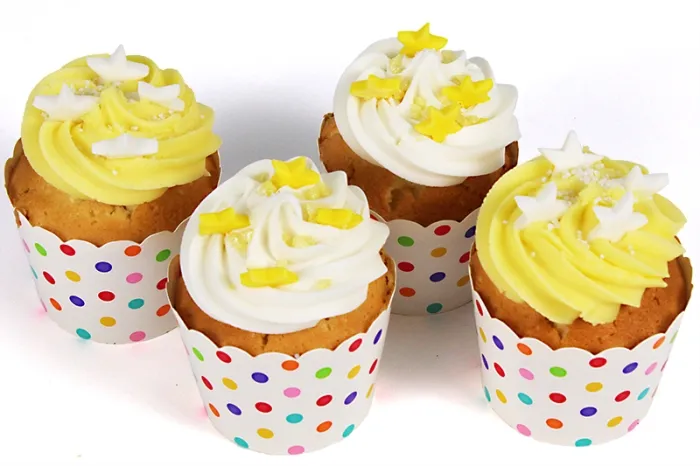 Our Little Lemon Birthday Stars Vanilla Cupcakes make a great birthday surprise. Each freshly baked cake is made from light Madeira sponge, generous swirls of smooth vanilla frosting and hand finished with a dusting of colourful lemon crunch and edible stars. Supplied with candle.