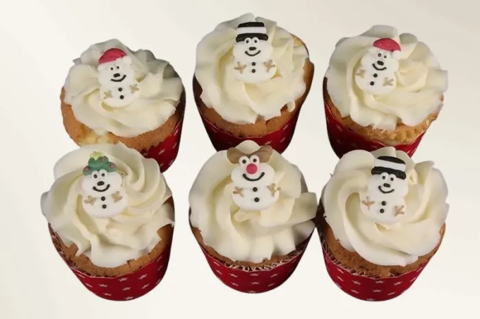 Little Santa cupcakes are made from Madeira sponge with a vanilla swirled frosting and topped with edible decorations and christmas cupcake cases.