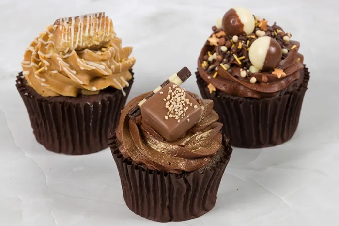 Made from Chocolate Genoese sponge and each cupcake centre is filled with either a soft blondie chocolate or soft toffee, before being topped with assorted milk chocolate and caramel decorations that include Cadbury Caramilk, caramel crunch, salted caramel Belgian Chocolates, golden vermicelli sprinkles and caramel shortcake bites to name a few. Frostings include a soft toffee frosting, a caramel fudge frosting and a milk chocolate frosting.