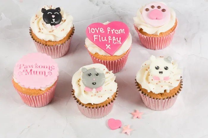 The decorations vary depending on whether they are being sent from the cat, the dog or a mix of both. You will find a selection of hand cut paw decorations, a stamped 'pawsome mum' message, bone or heart with your pets name and a selection of cat or dog faces. These fun cakes will just make Mum's day.