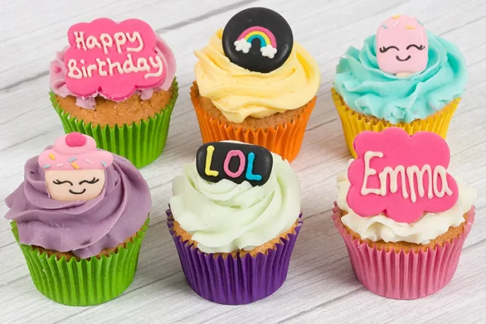 Personalise our colourful array of LoL design cupcakes with your choice of message(s) on one or two cupcakes. Edible plaques are cut out in a selection of colours to match the theme and hand piped with your message(s) before being placed on to our yummy Cupcakes. The remaining cupcakes have an assortment of fashionable royal icing designs in vibrant colours.