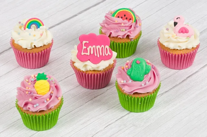 Personalise our eye-catching Tropical cupcakes with your choice of message on one cupcake. An edible plaques in vibrant pink is hand piped with your message before being placed on to our yummy Cupcakes. The remaining cupcakes contain an assortment of tropical themed sugar decorations to bring a taste of summer sunshine.