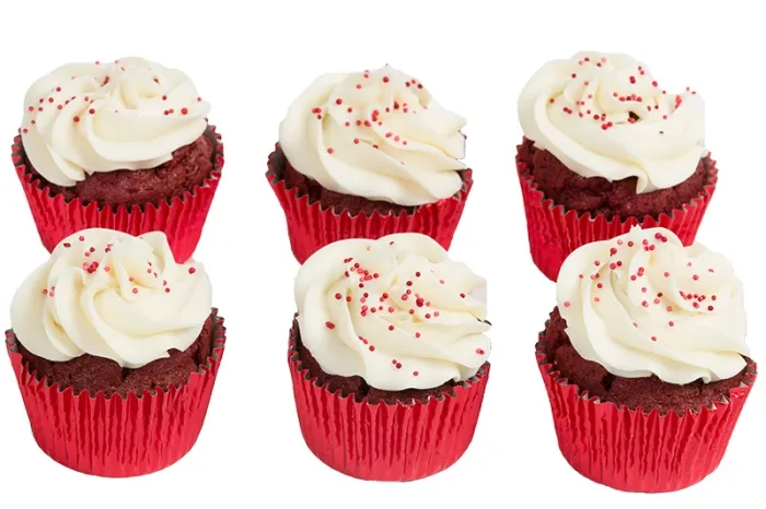 For people who like a hint of chocolate our red velvet cupcakes have a smooth vanilla frosting with sprinkles on a light and subtle chocolately red velvet base