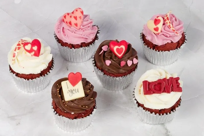 A fabulous collection of delicious Red Velvet Cupcakes that are sure to impress topped with Vanilla, Strawberry and Chocolate Frostings. Each cupcake is adorned with a vibrant chocolate heart decoration and includes a chocolate message of love, ensuring this gift is the perfect way to say I love you.