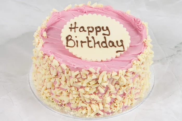 Our Strawberry Flake Sensation is made from light madeira sponge with delicious strawberry frosting and white chocolate flakes. Each cake is then hand finished with a chunky white chocolate plaque with your own edible message. Serving between 8 and 12 people this makes a great celebration cake.