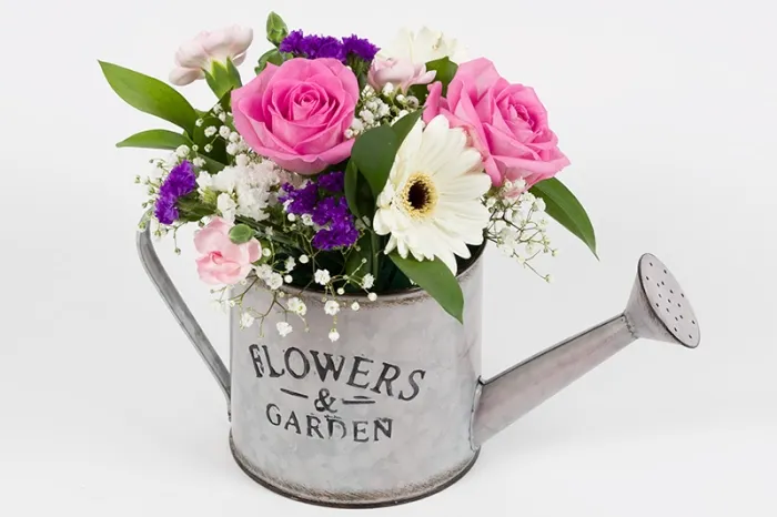 This bright and colourful fresh flower arrangement would be a joy to receive on any occasion. The mixture of vivid pinks, white germini and spray carnations fill this ornamental watering can and provides the perfect gift accompaniment to our delicious cupcake selections.